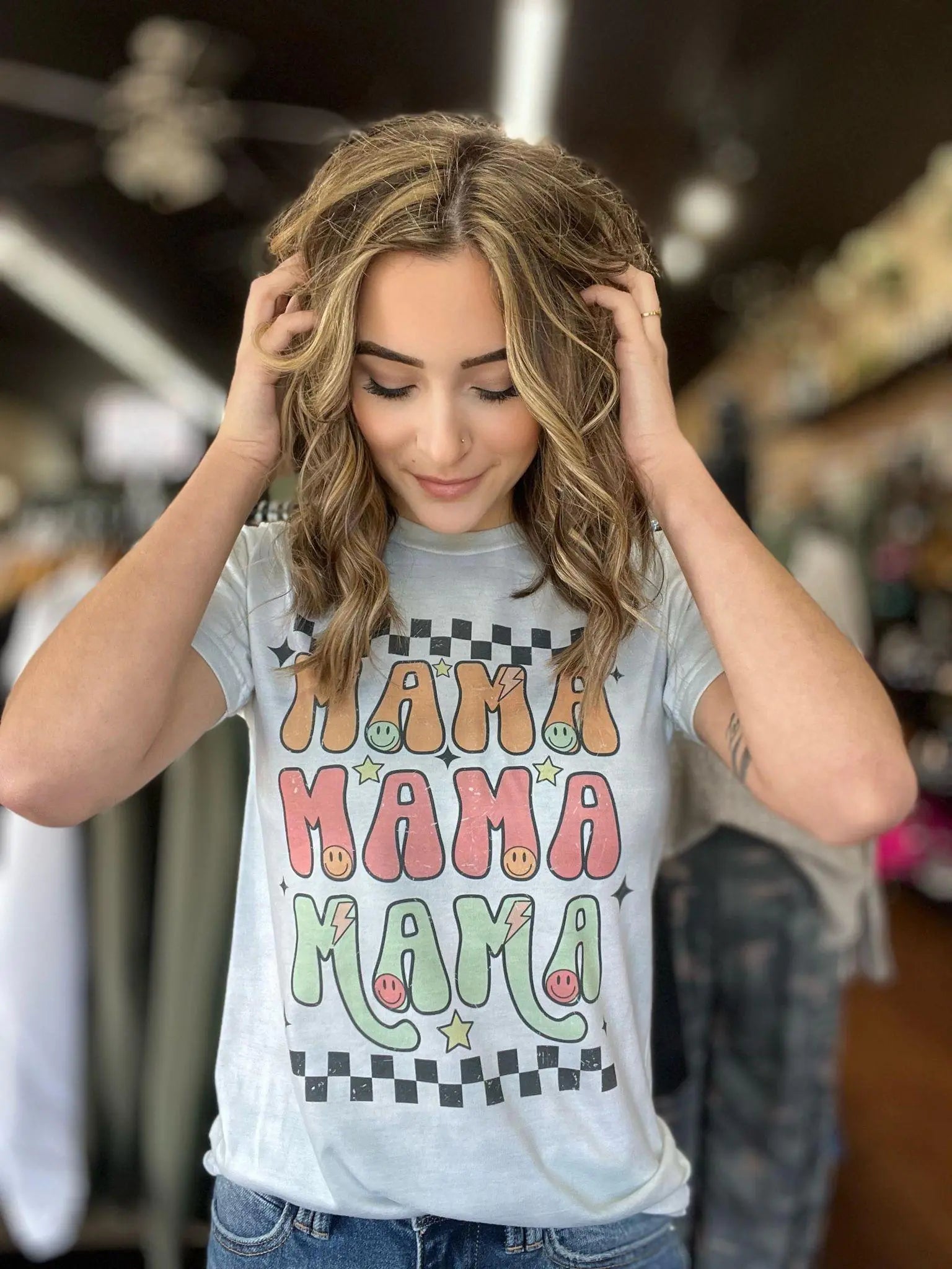 This mama tee is so FUN! This graphic is printed on a very light sage tie dye! Such a soft tee with a great fit!