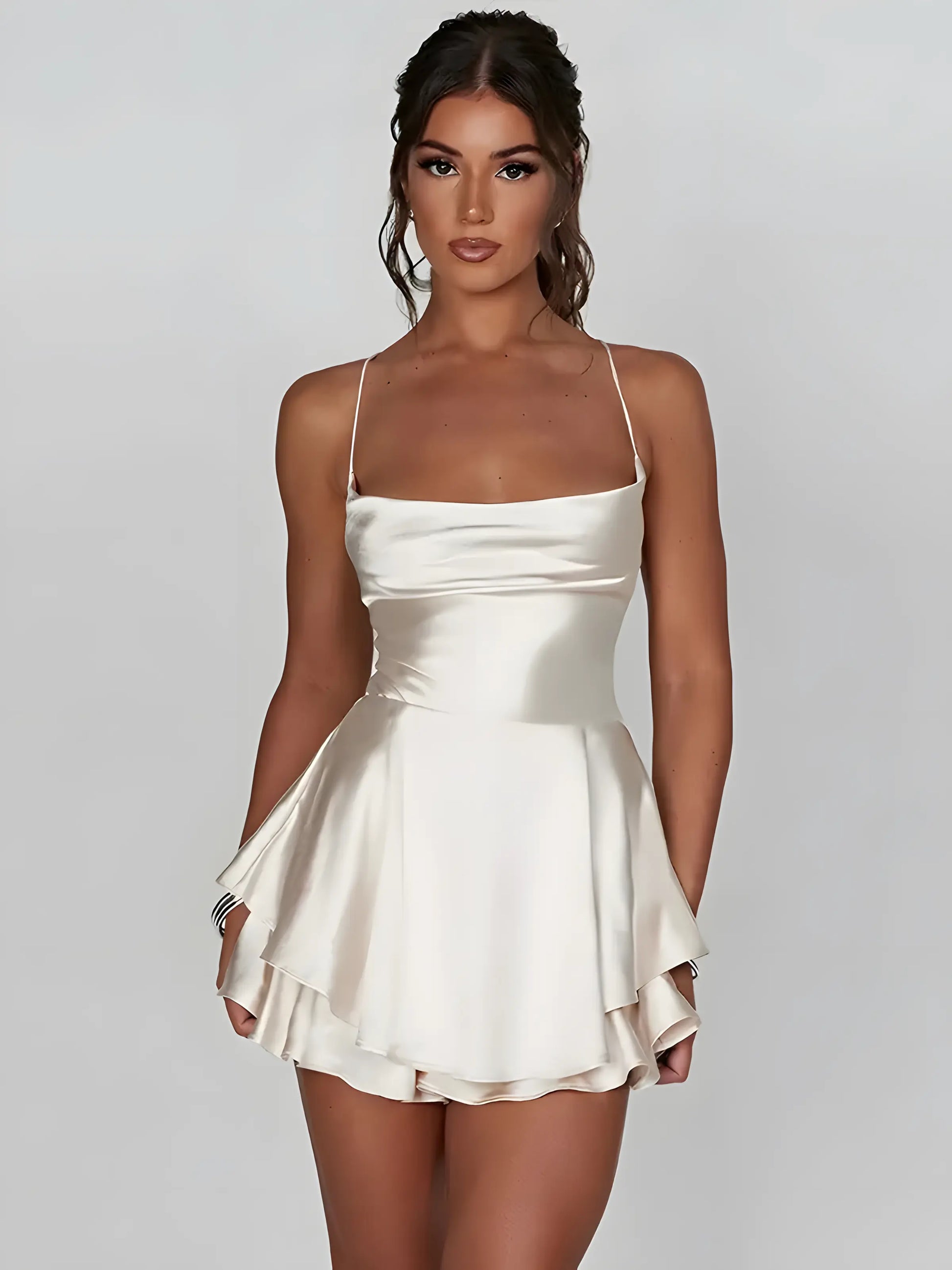 Enjoy comfort without compromising style in the mini satin cami dress, crafted from soft, breathable satin that feels gentle against your skin. Its adjustable straps ensure a perfect fit, while the mini length adds a touch of flirtatious charm to your ensemble.