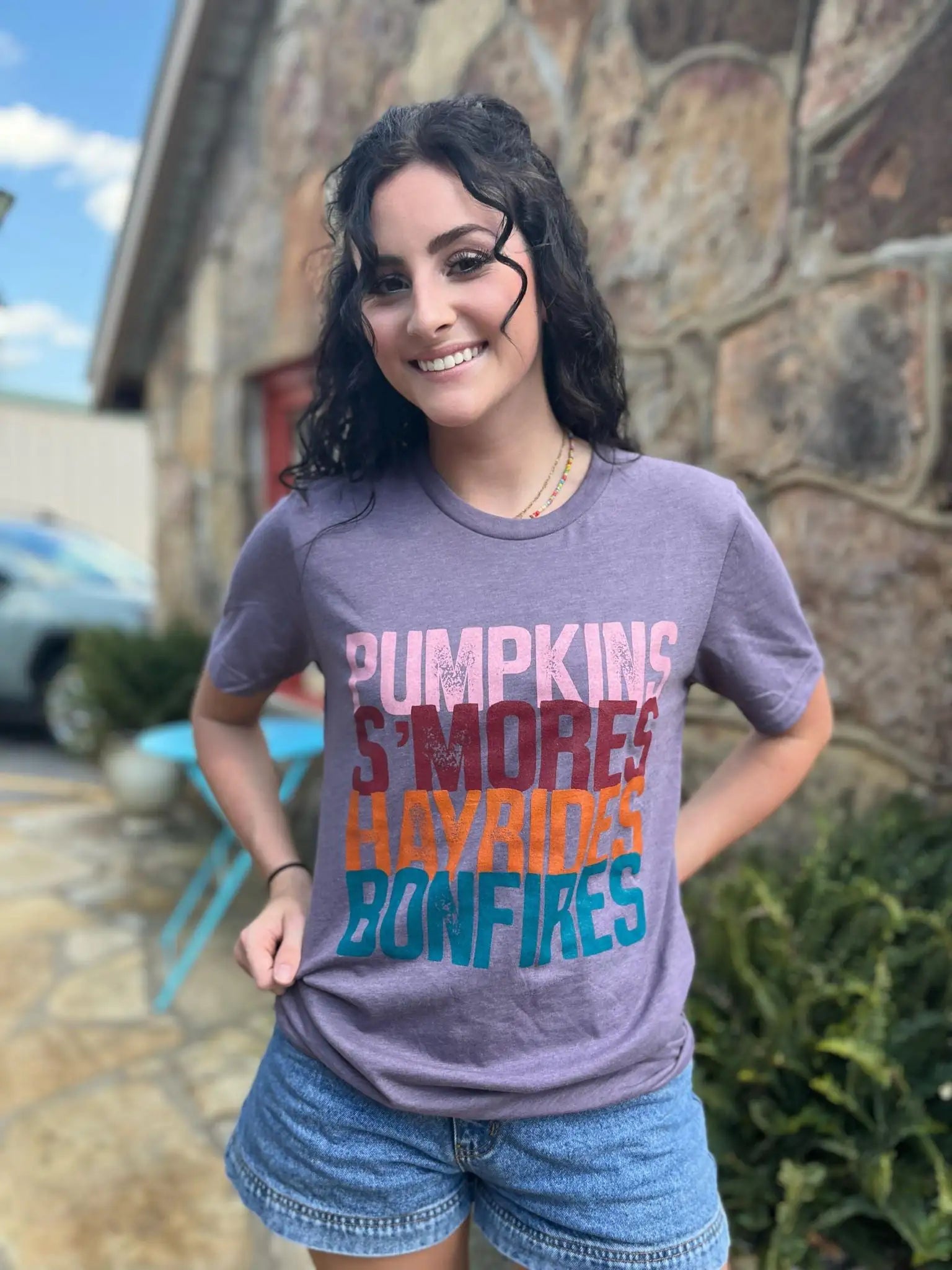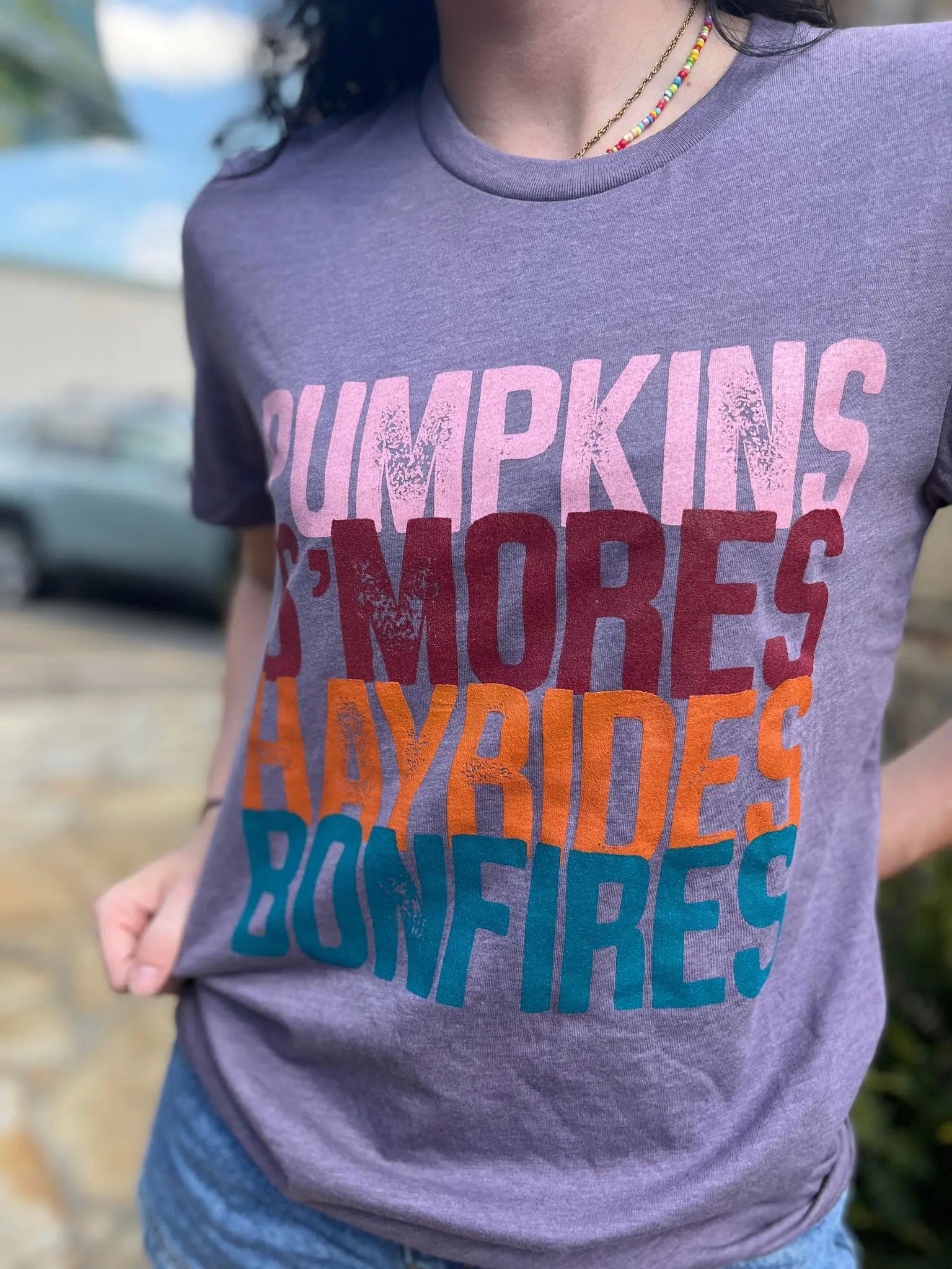 This tee lists all of our favorite things about fall - give us ALL of the smores and hayrides we can handle!